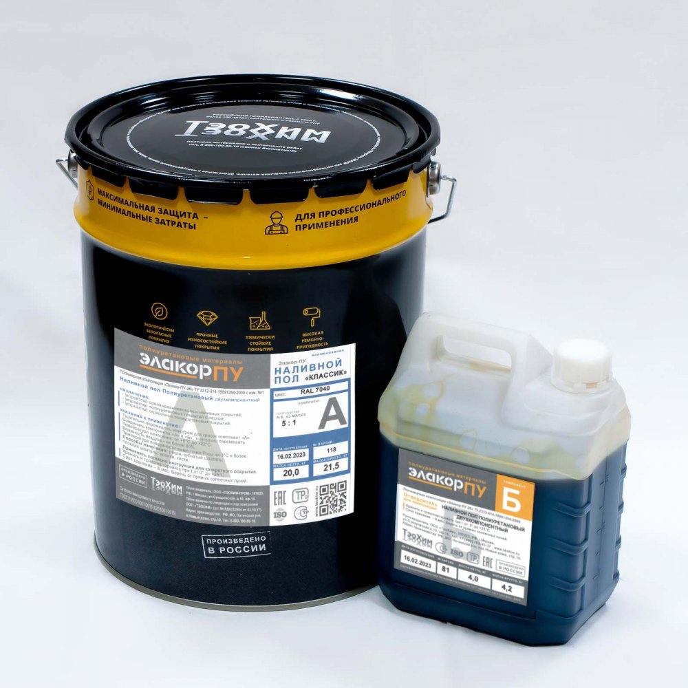 Полиуретановый наливной пол КлассикПолиуретановый Самовыравнивающийся наливной пол Элакор-ПУ Классик - цветной двухкомпонентный компаунд. После полимеризации образует твердо-эластичную ударопрочную поверхность с высокой износостойкостью и химической стойк